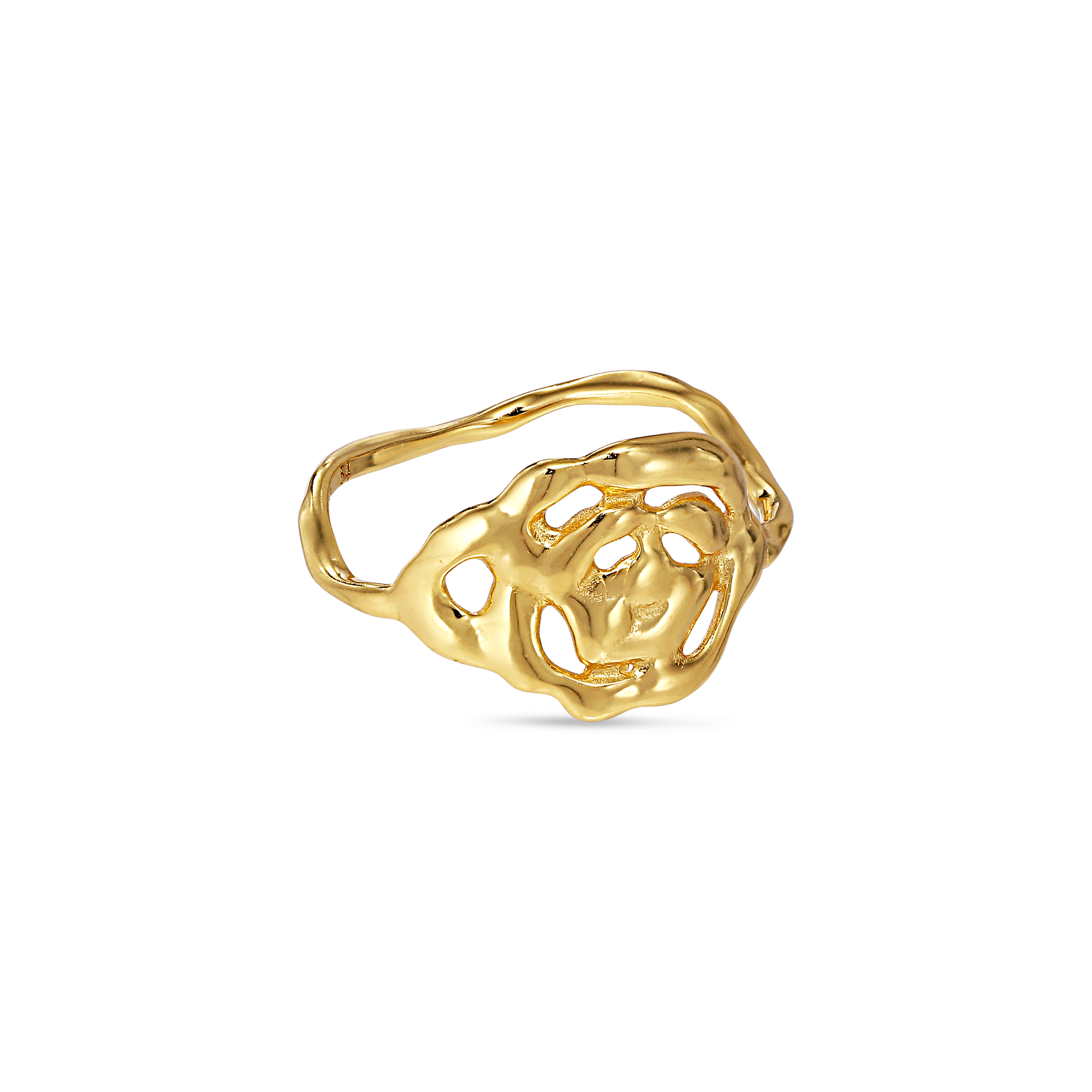 Rose ring i forgyldt 925 sterlingsølv. Ringen er sammensat af en organisk, snirklet rose, som følger fingerens kurve og en snoet ringskinne.