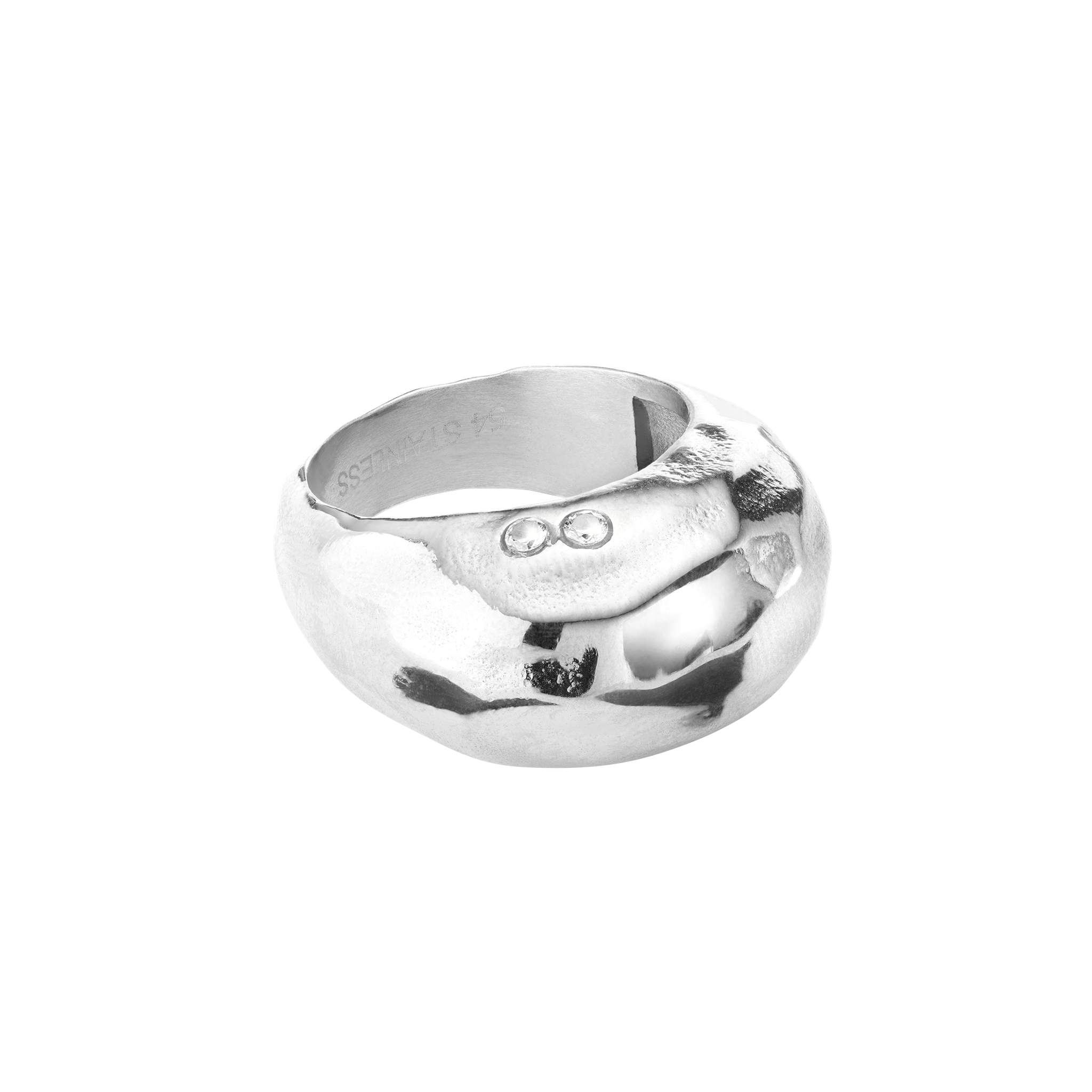 Ringen er udført i stainless steel, belagt med sterling sølv og fås også i stainless steel forgyldt med 18 karat guld. De to små sten er zirkoner.